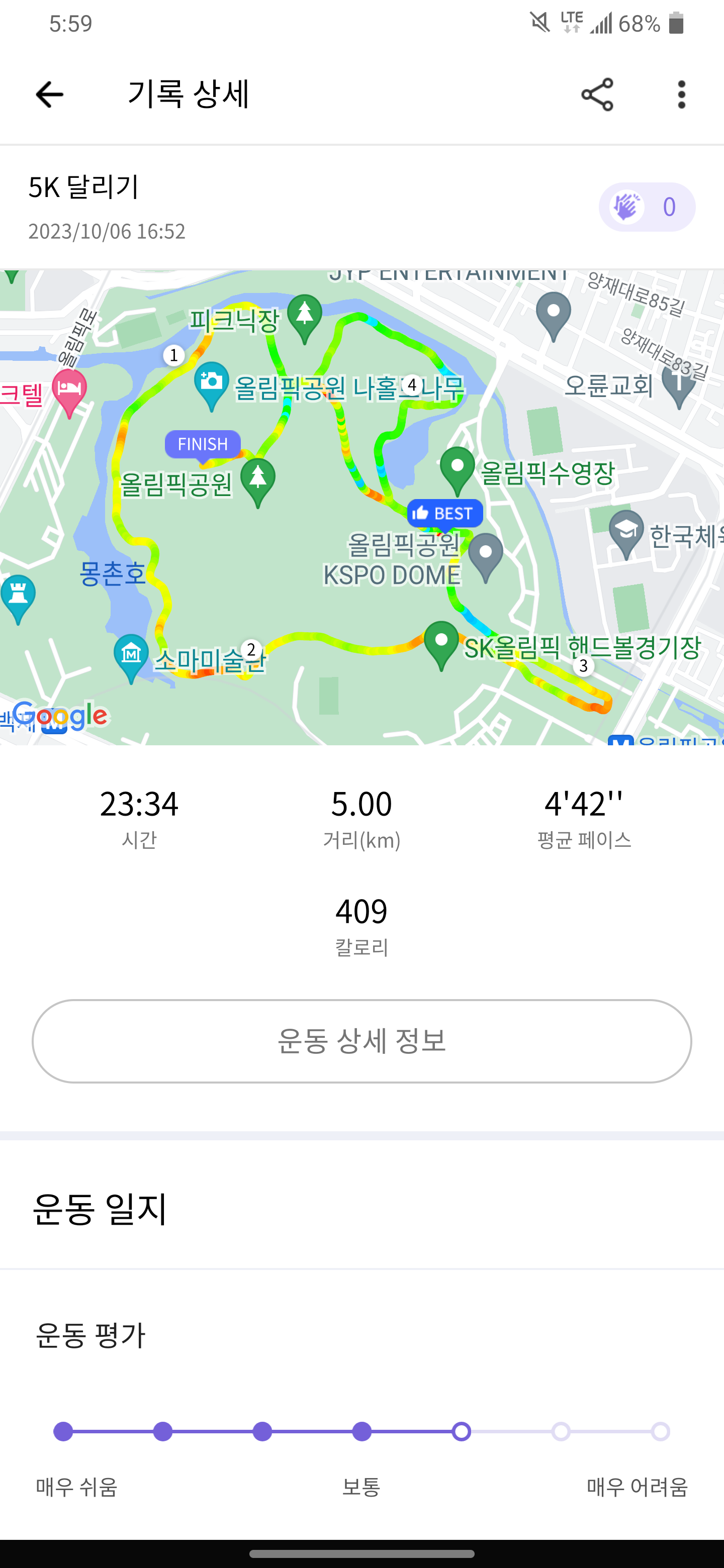 10월 6일 룸메이트의 첫 5km 기록 측정을 25분으로 마무리하는 것을 돕고자 페이서로 함께 달렸다. 초반 3km 동안은 5 min/km 아래의 페이스를 유지하는 데에 집중했다. 마지막 2km가 남은 상황에서 친구 상태를 보니 페이스를 올려도 괜찮겠다 싶어 마지막 두 구간은 4' 30'' / km로 페이스를 끌어올렸다. 5K도 끝내고 아티스틱 스위밍 훈련도 기분 좋게 마쳐서 여러모로 즐거운 운동을 한 날이다.