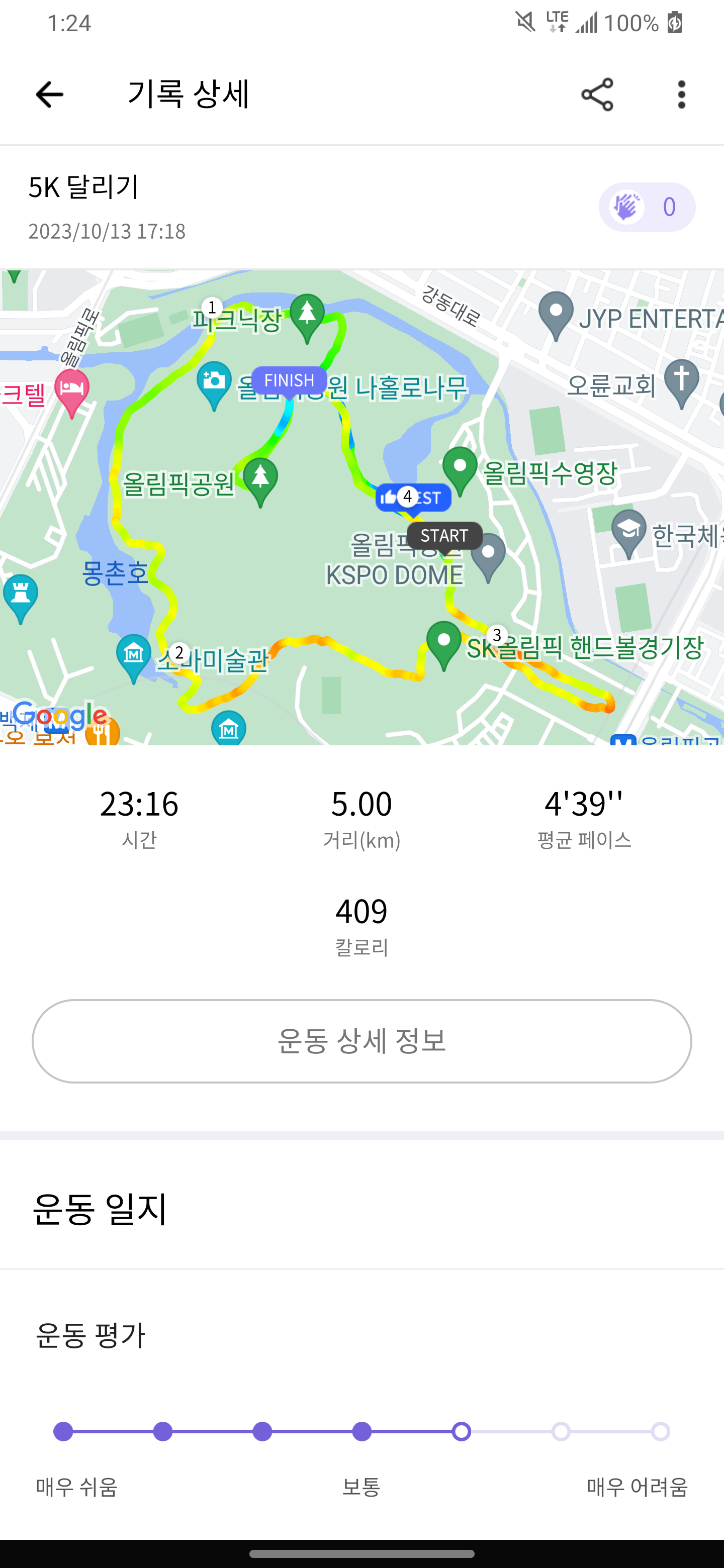 10월 13일 아티스틱 스위밍 훈련 전에 올림픽공원 5km 달리기를 룸메이트와 함께 하였다. 20분 아래로 완주하는 것을 목표로 이번 5km를 달리게 되었다. 1km 스플릿은 (3'53'' - 4'47'' - 5'10'' - 5'08'' - 4'18'')로 첫 1km 이후 힘을 잃어 기존의 목표에 미치지 못하는 기록을 얻게 되었다. 그럼에도 불구하고 초반 1km를 빠르게 뛰고 난 후 페이스를 망친 상태로 달리기를 마무리하는 경험을 하게 된 점에 있어서 이번 달리기는 수확이 크다고 생각한다. 짚고 넘어가면 좋을 부분은 처음 1km 이후 정신적으로 약해져 2~4km 구간을 나의 능력치보다 느리게 뛴듯한 느낌이 있다. 심지어 마지막 300m는 정말 스프린트를 했다고 할 수 있을 정도의 달리기 폼이 나왔다. 다음부터는 전체적으로 나의 힘을 고르게 사용하는 데에 더 집중해도 좋을 것 같다. 나의 풀코스 계획을 더욱 상세하게 이야기해 보자면 올해 11월 19일에 열리는 부천 복사골 마라톤대회 10km를 완주하고 서울 동아 마라톤 신청 자격을 취득하여 내년 3월 즈음 열리는 서울 동아 마라톤 대회에서 풀코스를 뛰고자 한다.