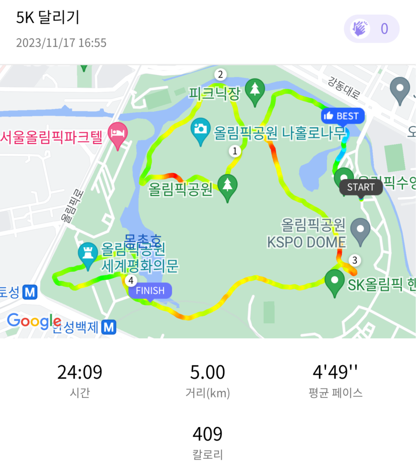 11월 17일 부천복사골마라톤대회를 2일 앞두고 5km 훈련을 진행하였다 온도는 0도 정도 되었던 것 같다. 3~4주간 심한 감기로 고생을 조금 해서 컨디션이 안 좋았다. 짧고 가파른 업힐 두 개 정도 있었던 러닝이었다. 오랜만에 해서 그런지 정말 시간 안 가더라. 결국 5km를 24분으로 완주하며 역대급으로 느린 기록을 뽑아냈다. 날씨가 추우니 러닝 하며 코피가 꽤 나더라. 부천복사골마라톤대회 훌륭하게 끝내고 싶다.