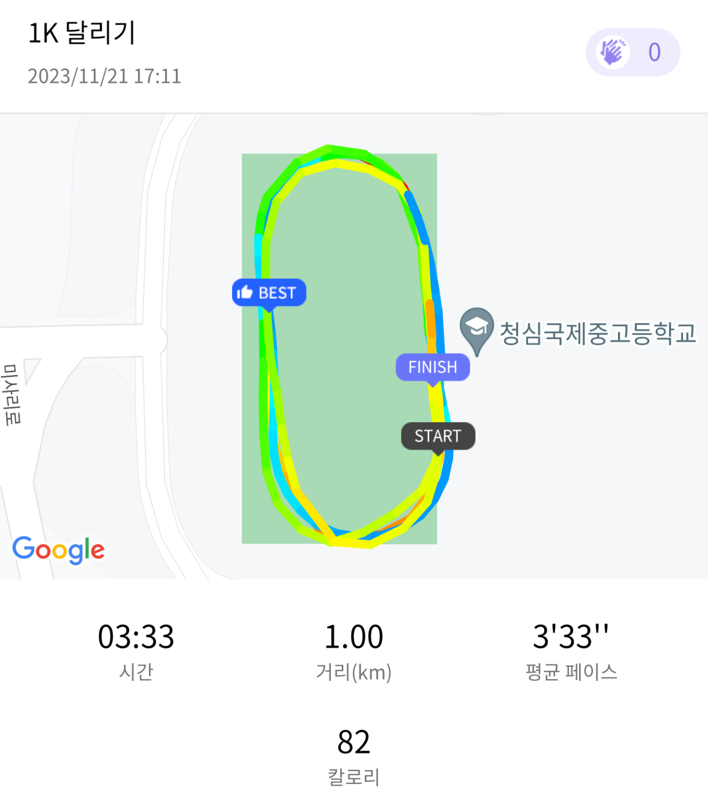 2023년 11월 21일 저녁시간에 헬스를 안 하고 운동장에 나와서 뛰었다. 원래 이두 할 생각이었는데 점심시간에 벤트오버레터럴레이즈하다 허리가 나가서 저항운동할 엄두가 안 났다. 날씨는 조금 춥지만 1km PB를 세워보고 싶어서 뛰어보았다. 3분 33초로 마무리하였다. 진짜 말도 안 된다. 날씨가 추워서 목에서 피맛이 조금 느껴졌다. 올해 남은 기간 동안 야외에서 거친 호흡은 삼가겠다. 오히려 풀마향 소재를 만들고 싶어서 달리기를 하는 느낌도 있다. 어쨌든 내년 4월에는 서울 하프 마라톤 한 번 나가고 5~6월 즈음에 풀마라톤 하나 나갈 계획이다. 다들 힘내라 응원하는 사람들이 많다.