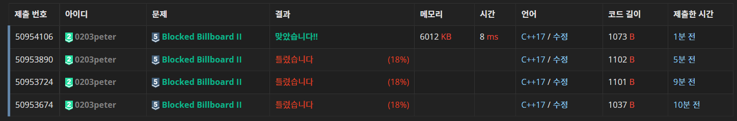 아쉬운 점 : 문제의 좌표를 정확하게 이해하지 못해 반례를 직접 만들고 나서야 정답을 받을 수 있었다.