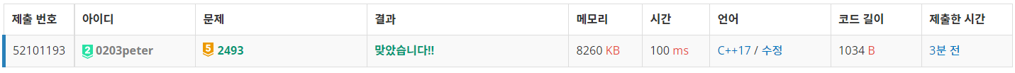stack을 사용해 해결해줄 수 있는 문제이다. 특정 위치에 있어서 해당 위치 이전에 있는 탑들이 현재 위치에 있는 탑들보다 작을 경우 이후의 탑들에서 해당 작은 탑들에 도달할 수 있는 방법은 없다. 이 원리를 이용해 한번 탐색해준 탑은 사용하거나 제거해줄 수 있는 것이다. (시간 복잡도 $O(N)$)